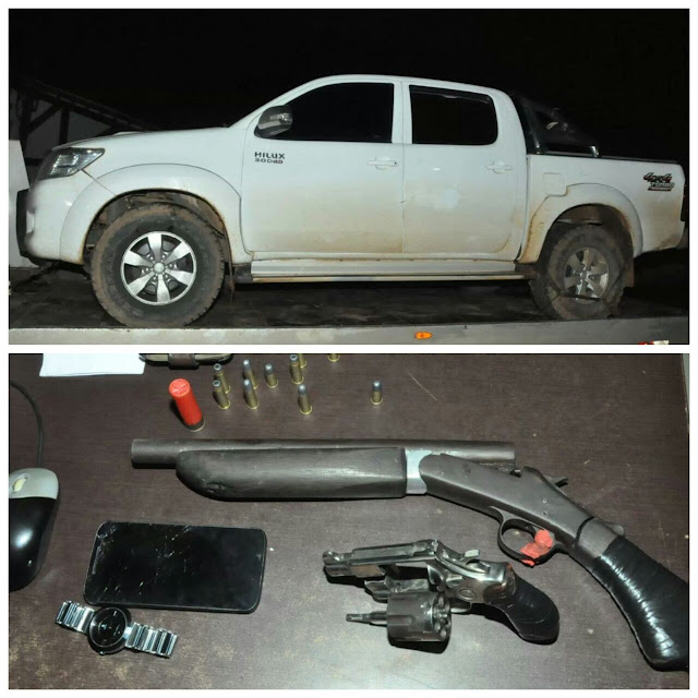 De acordo com a polícia, o carro estava estacionado em frente a uma residência, ao entrarem os bandidos fugiram pulando cercas pelo fundo da casa. Ainda foram apreendidos uma escopeta calibre 16 e um revólver calibre 38 municiado. As armas podem ter sido usadas no assalto, o carro e as armas foram levados para à Delegacia Central de Flagrantes para devidas providências.